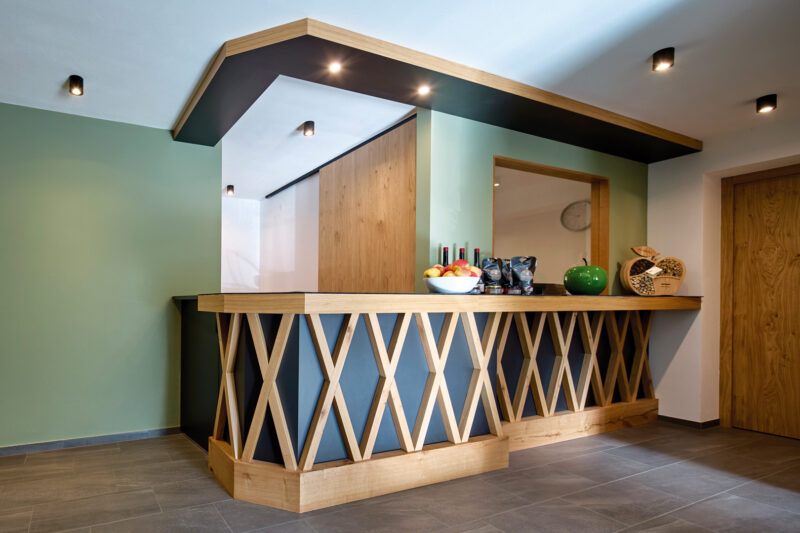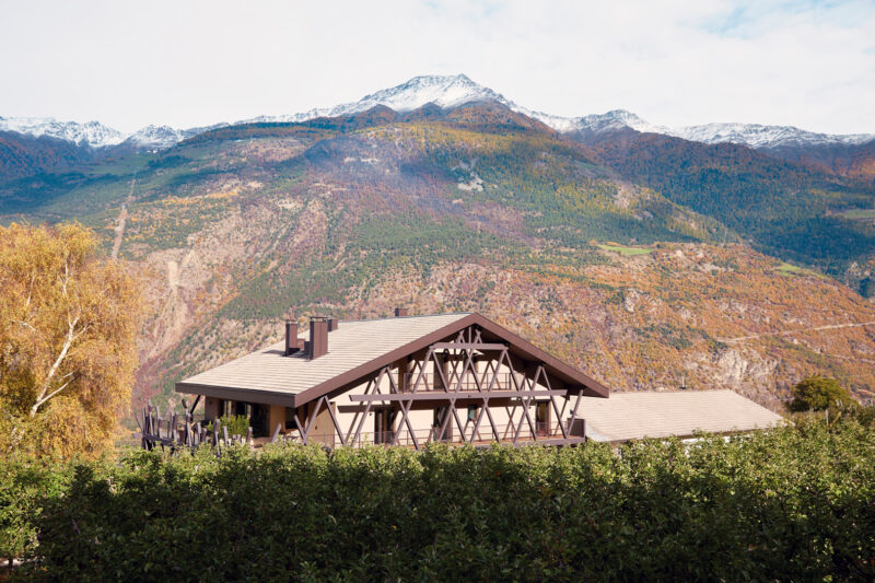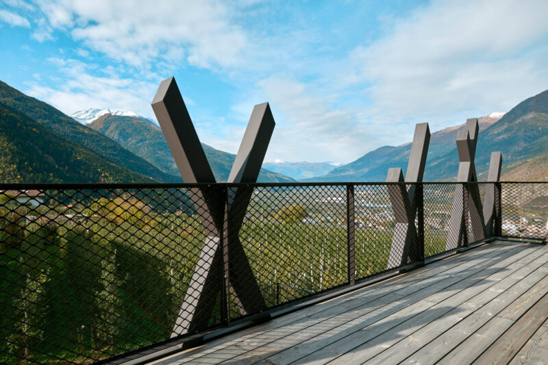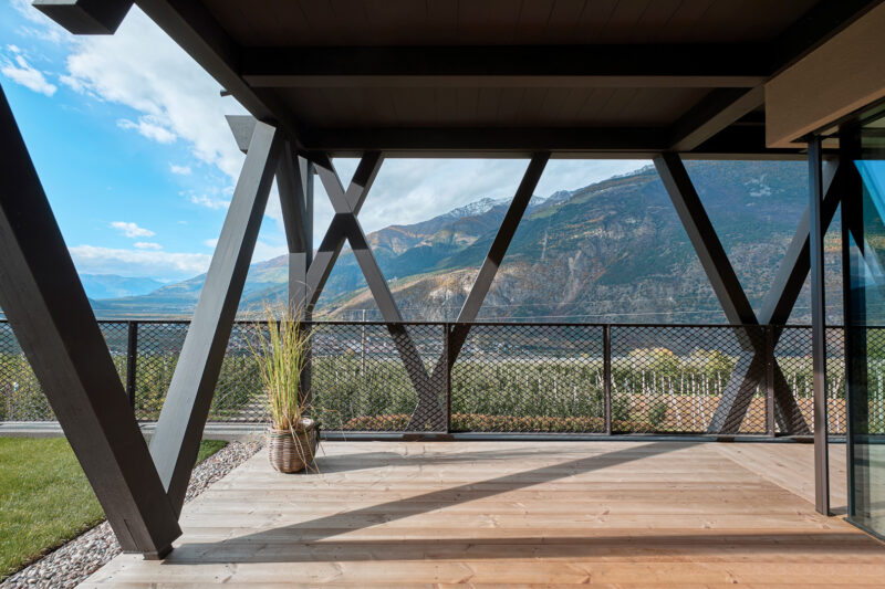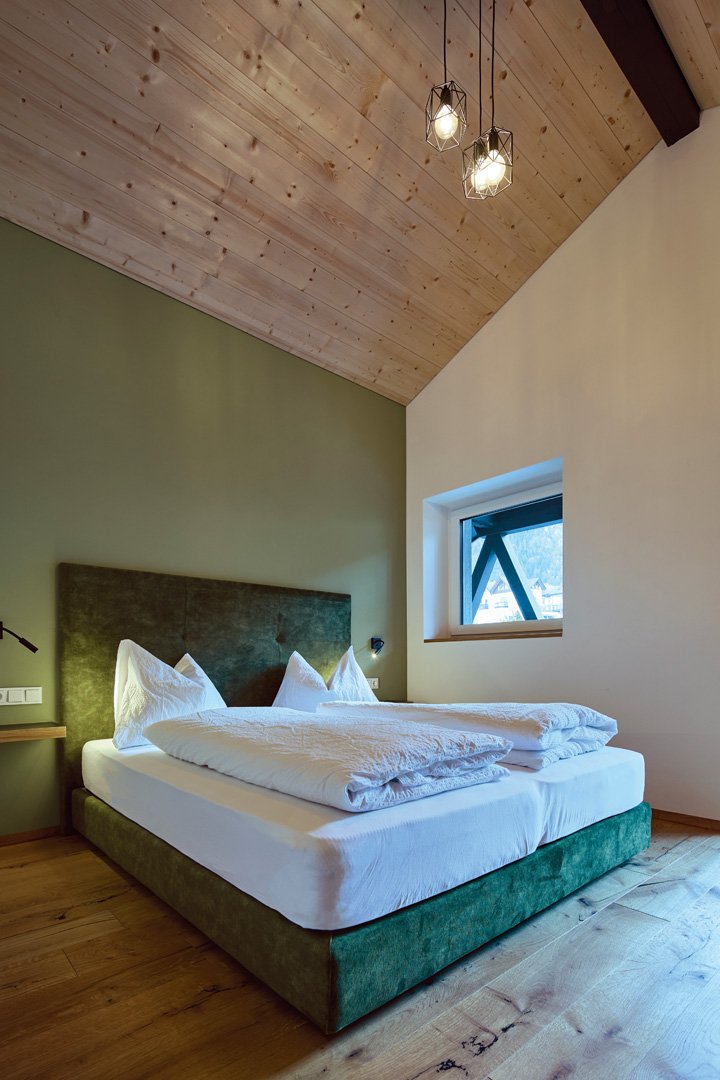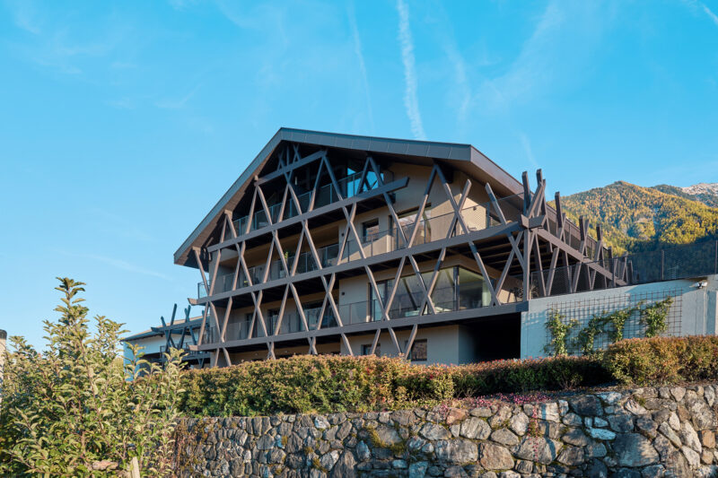 Im Inneren dominieren natürliche Materialien: Holzelemente, geerdete Farbtöne und eine präzise Lichtführung schaffen eine warme, ruhige Atmosphäre. Großzügige Verglasungen öffnen die Wohnungen zu den Obstwiesen und zum Panorama des Vinschgaus.
