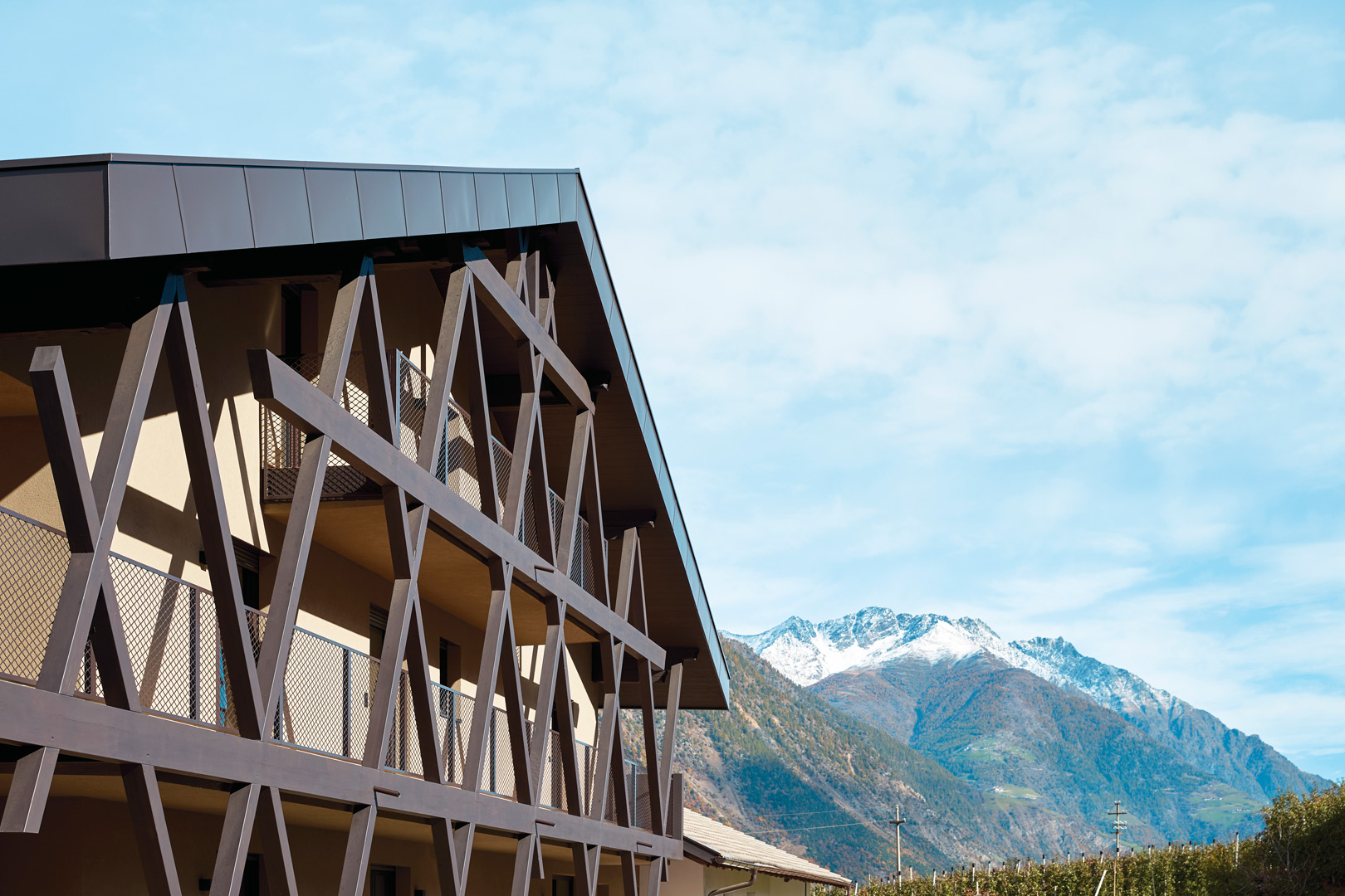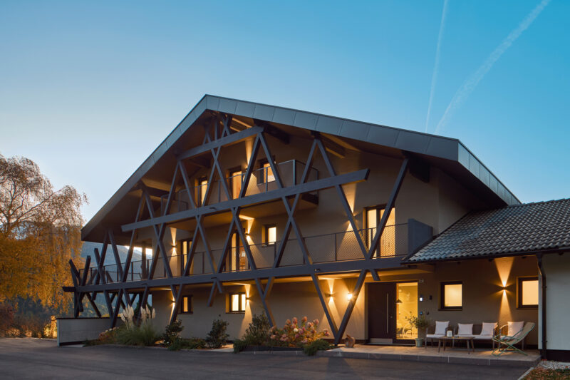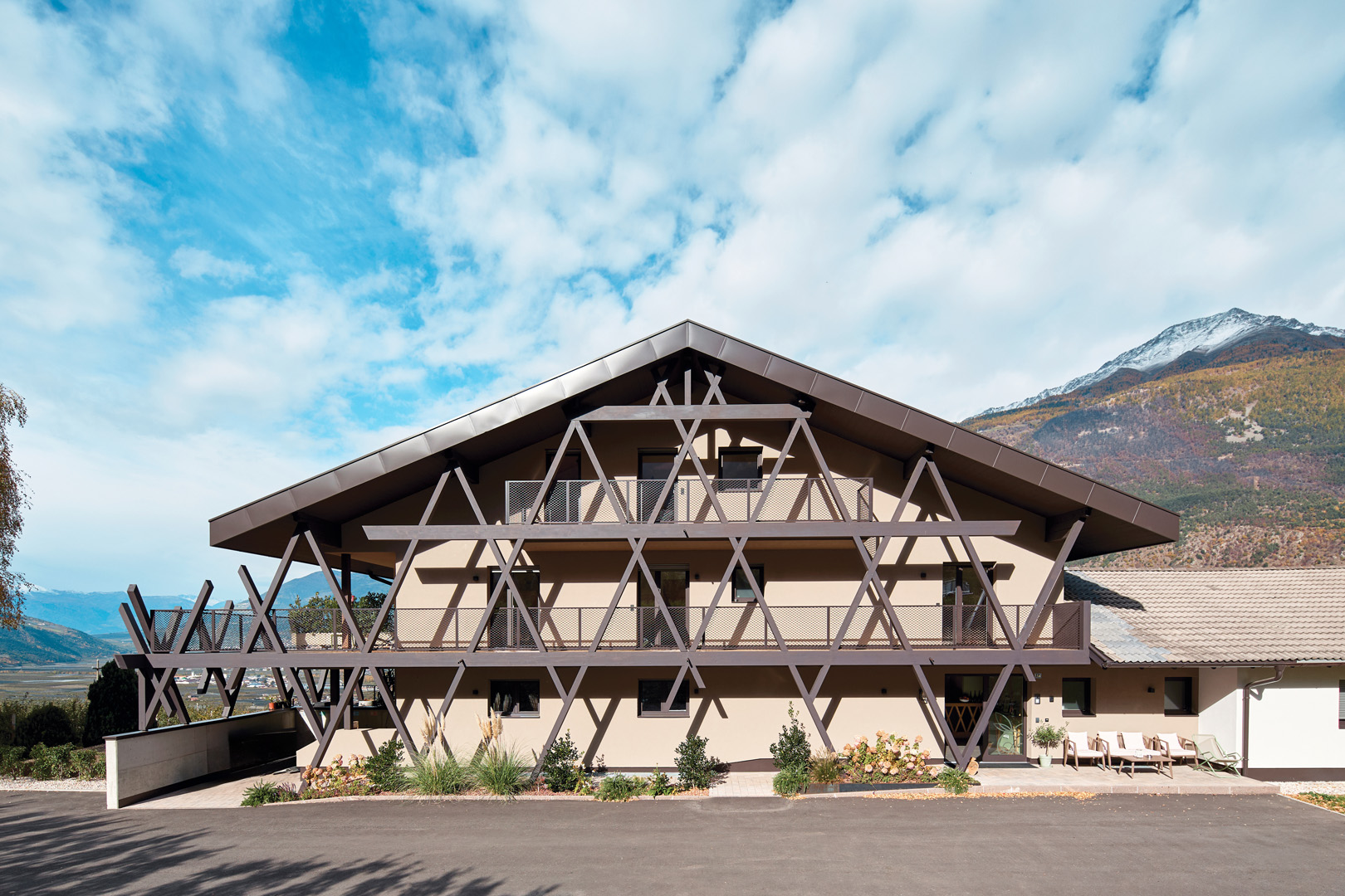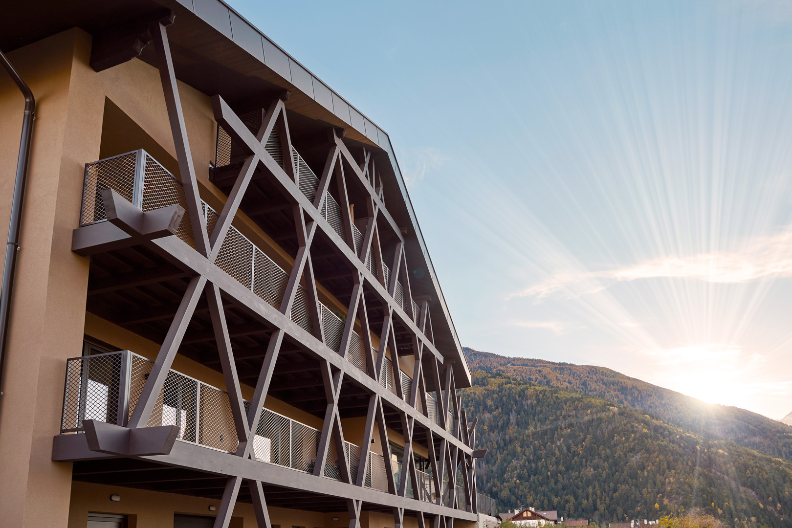 Prägendes Element ist die vorgestellte Holzstruktur, die das Gebäude neu definiert. Die dunkel lasierten Traggerüste erweitern die bestehenden Balkone zu großzügigen Außenräumen und verleihen dem Baukörper eine rhythmische, fast skulpturale Tiefe. Die neue Fassadenschicht bildet einen starken Kontrast zum hellen Edelputz und fügt sich gleichzeitig selbstverständlich in die alpine Umgebung ein.