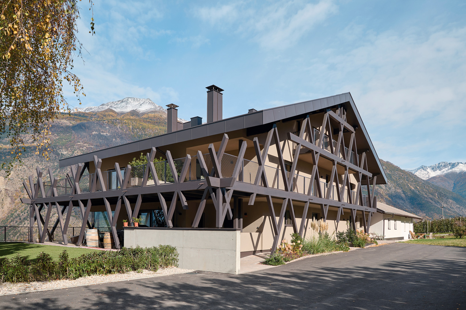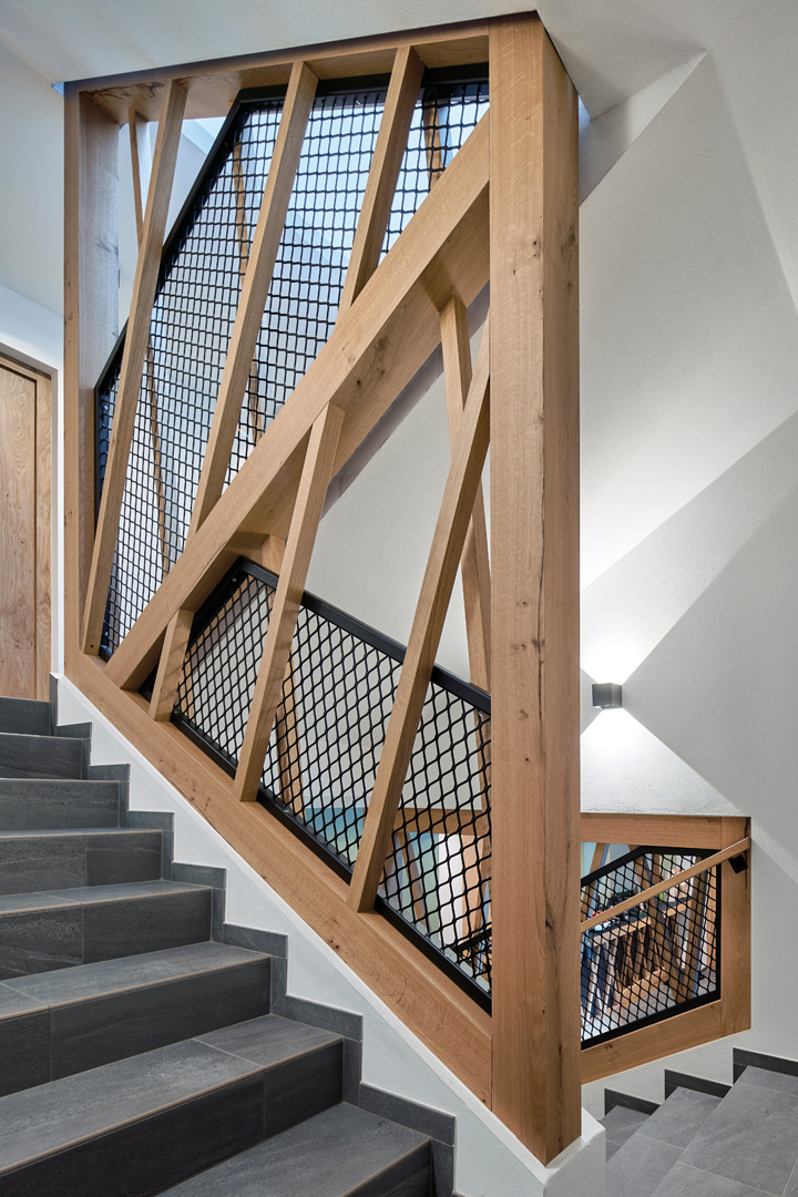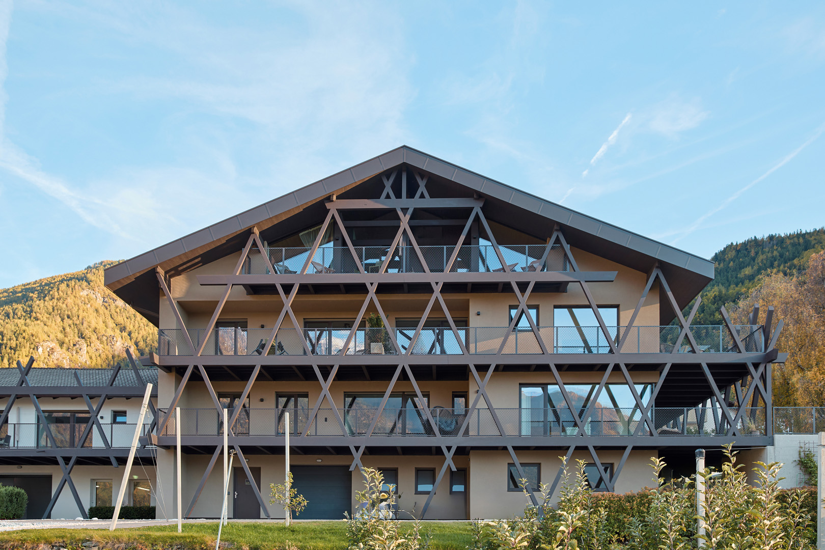 Prägendes Element ist die vorgestellte Holzstruktur, die das Gebäude neu definiert. Die dunkel lasierten Traggerüste erweitern die bestehenden Balkone zu großzügigen Außenräumen und verleihen dem Baukörper eine rhythmische, fast skulpturale Tiefe. Die neue Fassadenschicht bildet einen starken Kontrast zum hellen Edelputz und fügt sich gleichzeitig selbstverständlich in die alpine Umgebung ein.