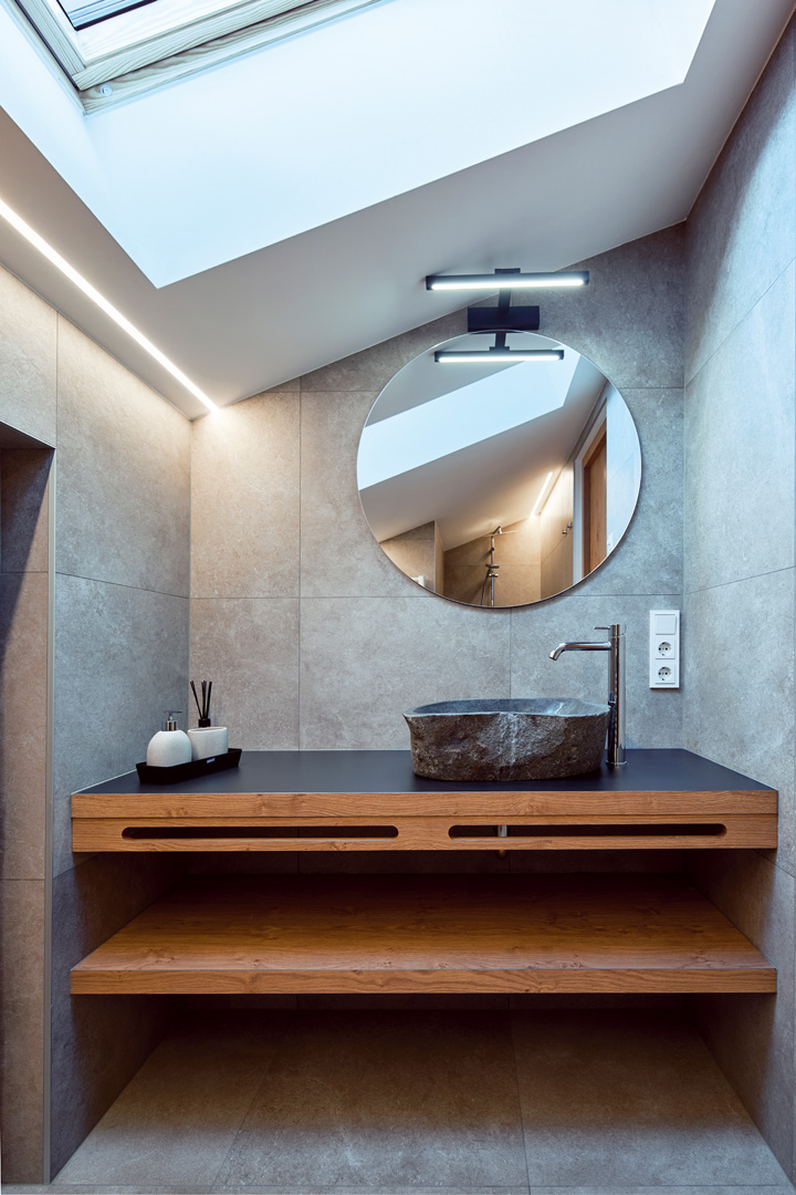Die energetische Sanierung – mit Außendämmung, neuen Fenstern und moderner Haustechnik – hebt das Gebäude auf ein zeitgemäßes Niveau. Ergänzend wurden Zufahrten optimiert, Außenräume neu geordnet und Stützmauern begrünt, sodass ein harmonischer Übergang zwischen Architektur und Landschaft entsteht.